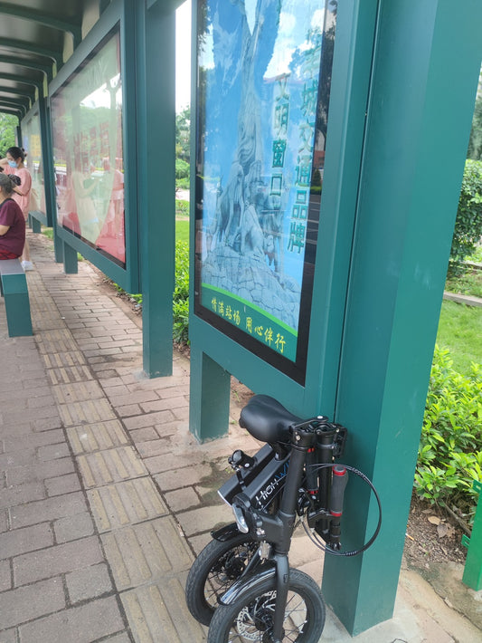 Waiting for the bus with a folding bike named Highwing Bike. https://www.highwingtour.com/